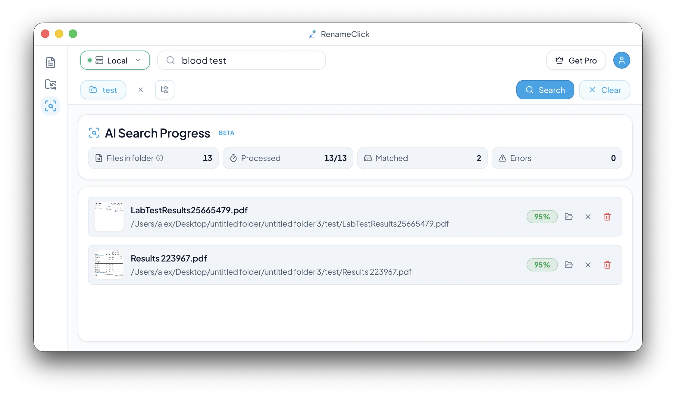 In RenameClick, AI Search is built as a dedicated workspace with recursive scanning, live counters, match-only results, and practical row actions. It is designed for discovery first, so results are read-only by default.