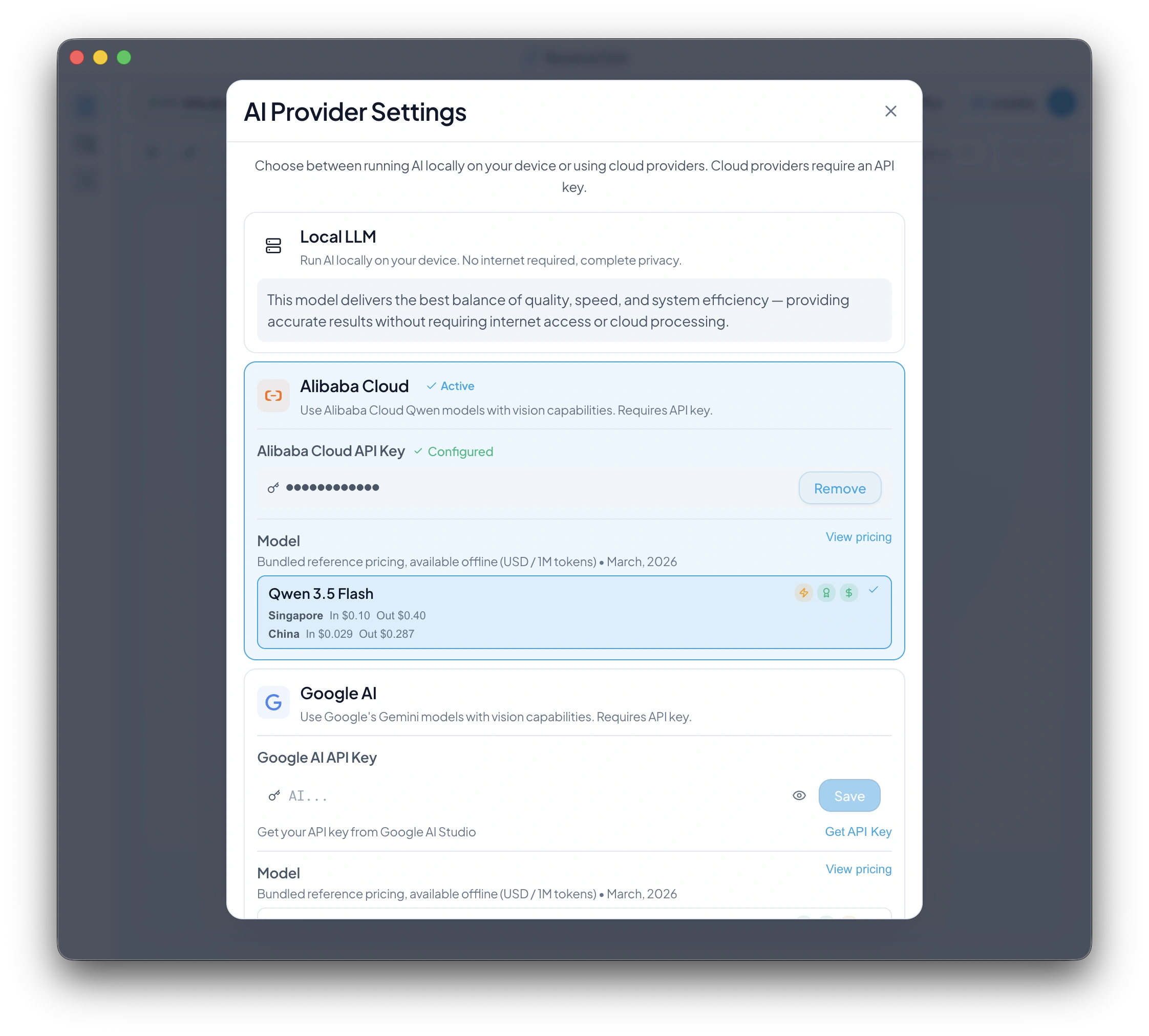 RenameClick now supports Alibaba Cloud as a cloud AI provider, powered by Qwen 3.5 Flash.